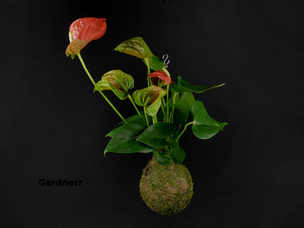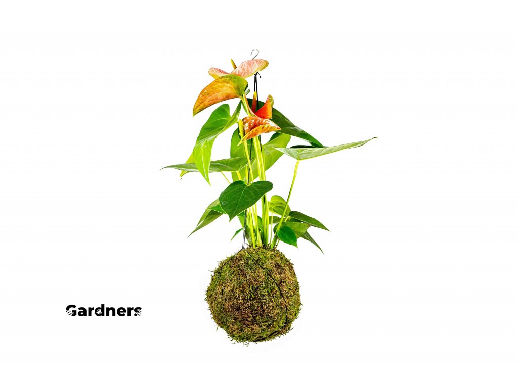Kokedama Anthurium andraeanum oranžová (L) Anturie, toulitka, prasečí ocásek