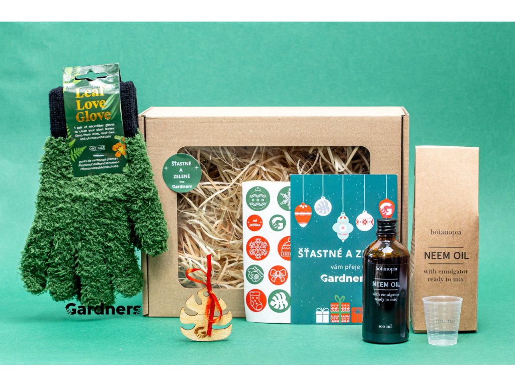 To vše je zabaleno ve vánočním dárkovém balení doplněném o vánoční přání s ozdobou a samolepky Gardners. Praktické i krásně osobní překvapení pro každého, kdo chce mít pokojovky zdravé s krásně lesklými listy.
